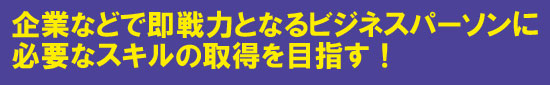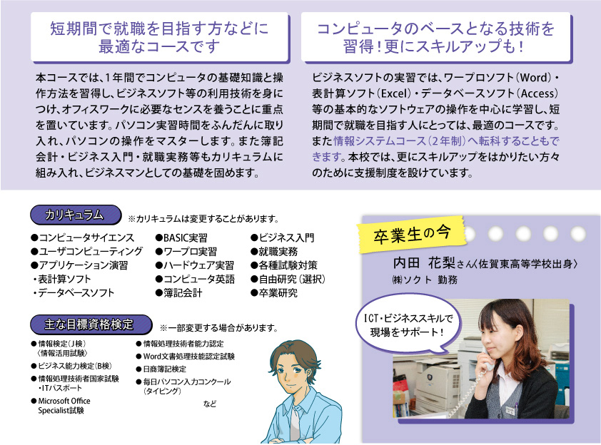 ![]() 本コースでは、1年間でコンピュータの基礎知識と操作方法を習得し、市販のビジネスソフト等の利用技術を身につけ、オフィスワークに必要なセンスを養うことに重点を置いています。 ビジネスソフトの実習では、ワープロソフト・表計算ソフト・データベースソフト等の基本的なソフトウェアの操作を中心に学習し、企業の求める人材となるべく、パソコンを使いこなすための知識・技術を1年間の学習で身につけることができます。短期間で就職を目指す人にとっては、最適のコースです。 ![]() 情報ビジネスコースでは、選択授業の「華道」によって、感性教育、マナーや礼節を重んじる基本がうまれます。技術だけでなく、職業人を育てることを目標にしています。 |