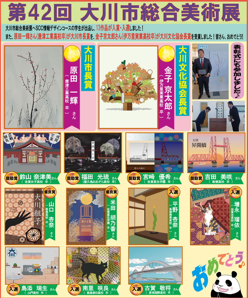 大川市総合美術展へ情報デザインコースの学生が出品し、13作品が入賞・入選に選ばれました! またその中で、大川市長賞に原田一輝さん、大川文化協会長賞に金子京太郎さんが選ばれています。 みなさん、おめでとう!